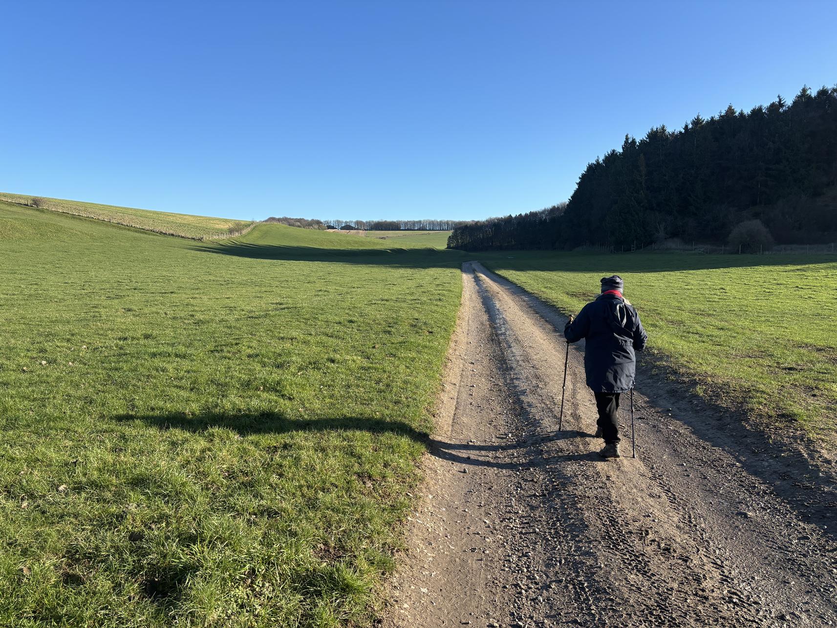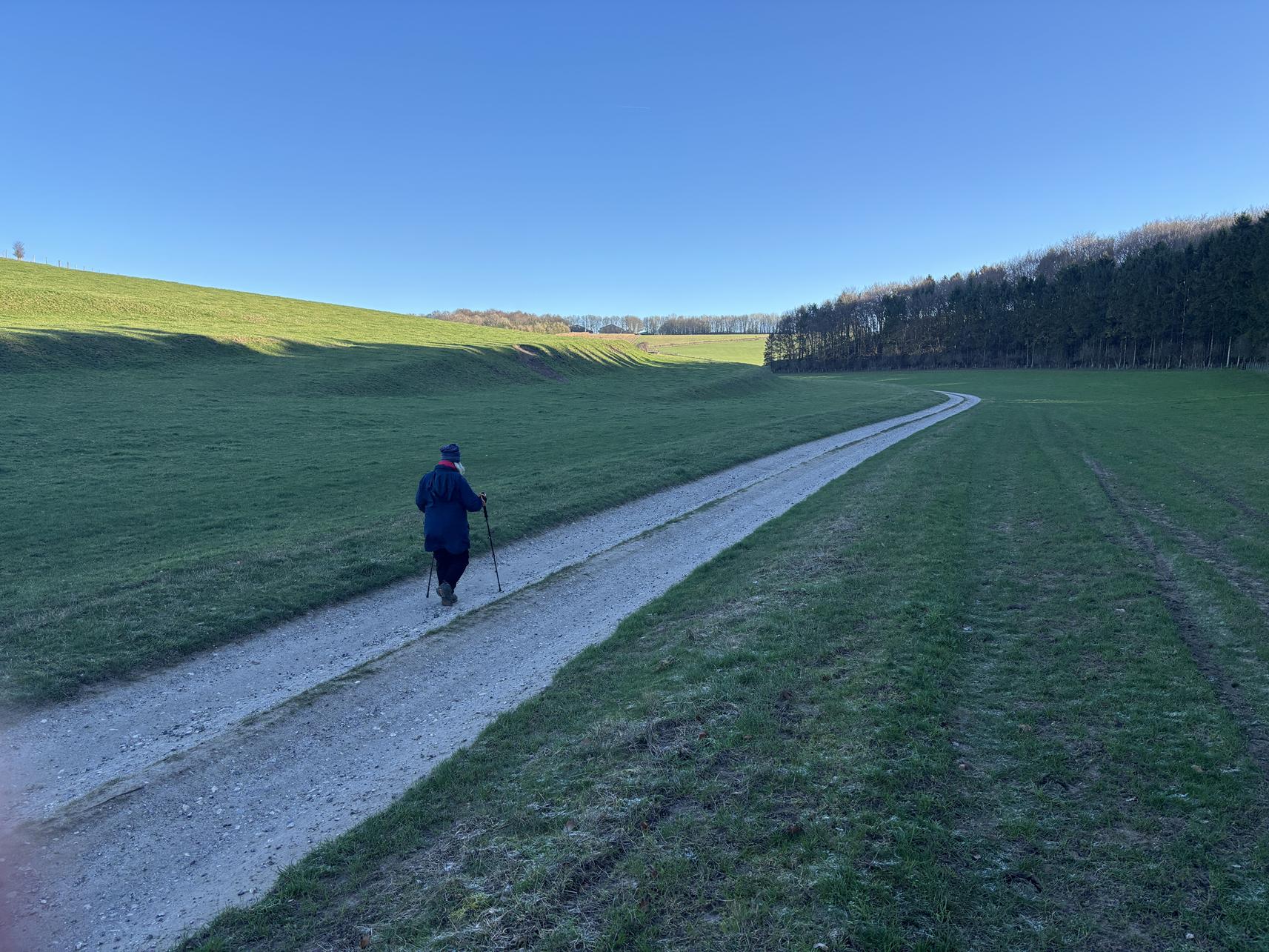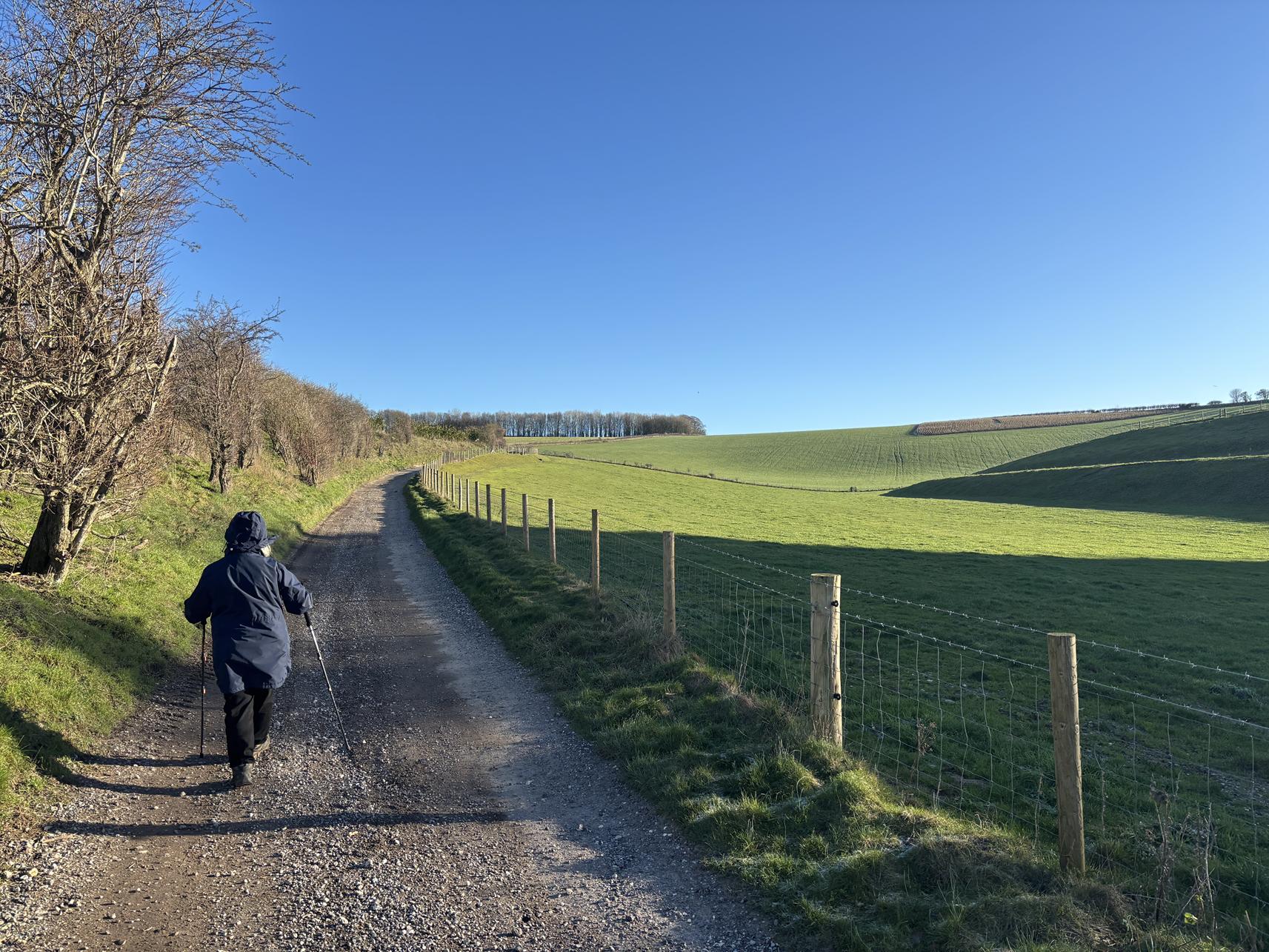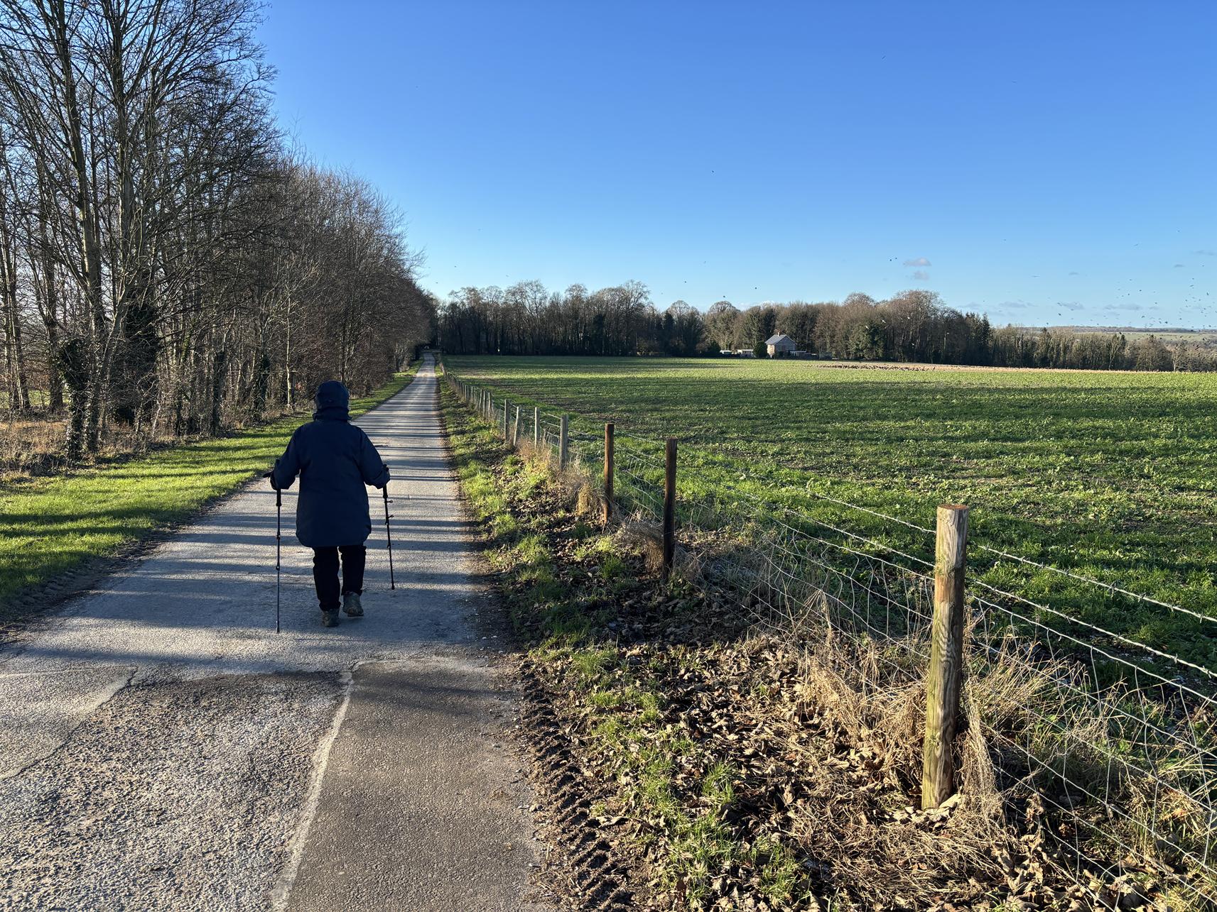 This is a very easy walk – it is entirely on gravelled farm track. The map speaks for itself : a rough rectangle starting at the village church and passing through typical farmland on the edge of Salisbury plain.