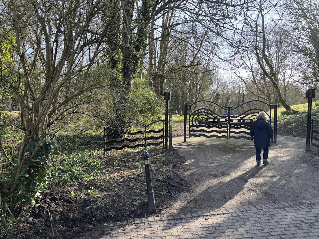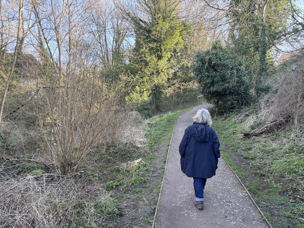 6: Walk down hill on road until entrance to footpath entry on right (by iron railings over river). Follow path through trees until meet road 280m