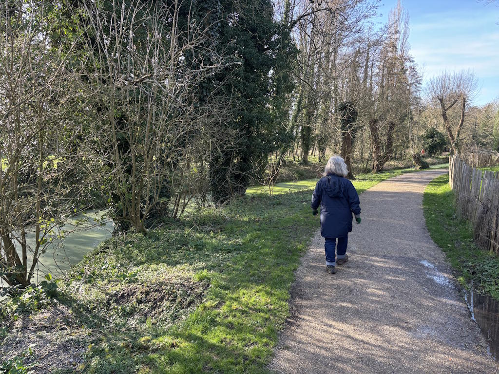 Start: Leave car park onto main road, turn left and cross water. Walk towards path gates 160m
