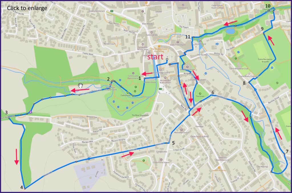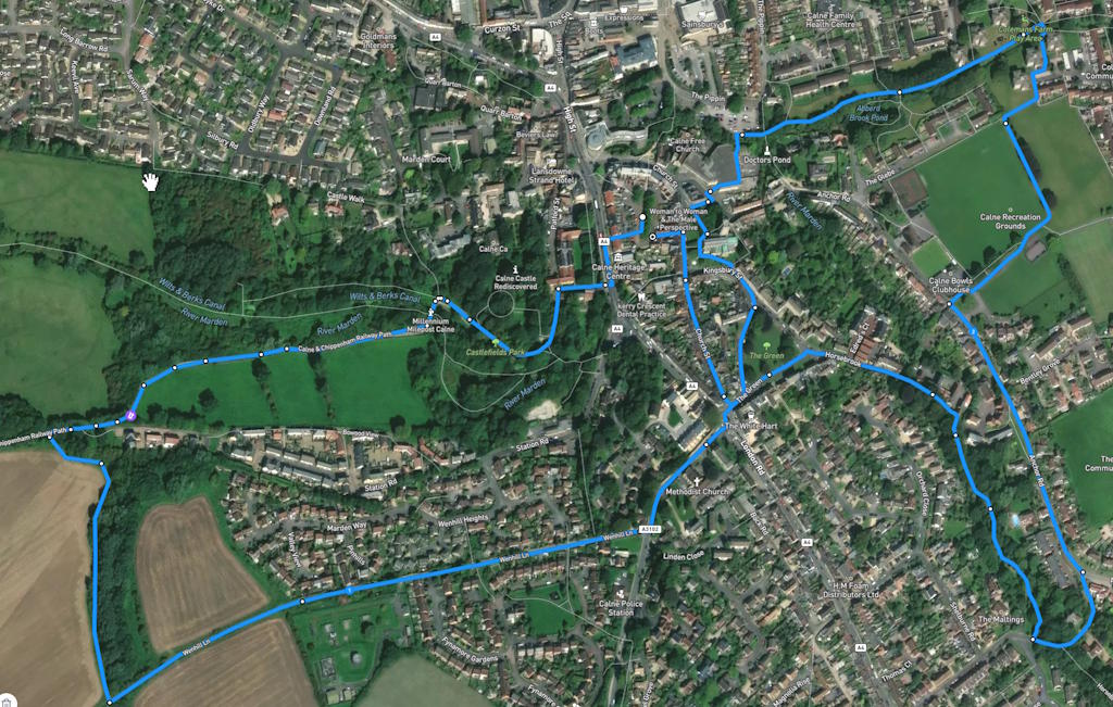 A 3.5-mile easy circular walk around Calne. Click map below to enlarge. Click here for an aerial view. Click here for a downloadable PDF guide of this page. (There is a GPX route option here for phone/tablet download – some browsers need “save as”. But only follow this link after watching this GPX help video). Friendly warning: all files relating to walks are published here in good faith but on the understanding that users must be responsible for their own safety and wellbeing..